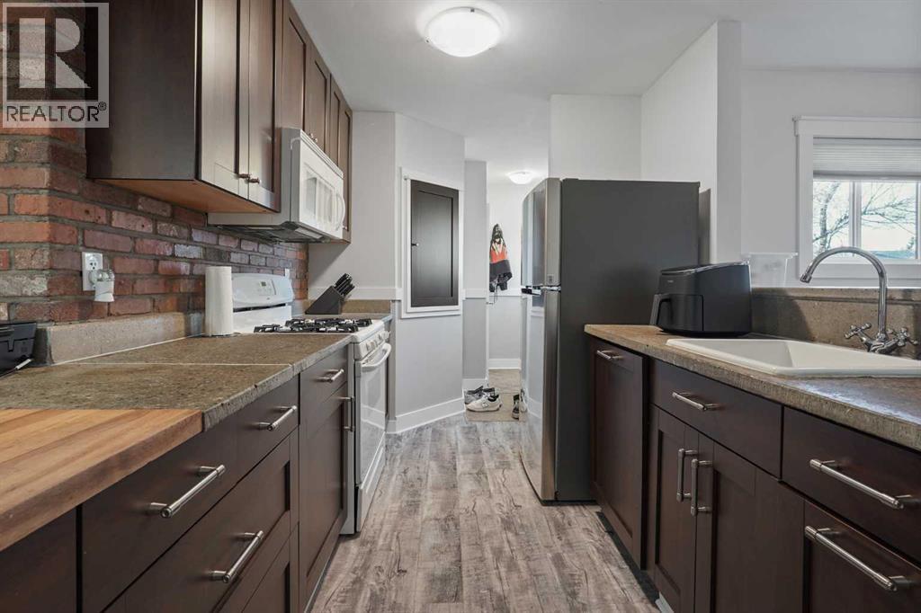 Welcome to this charming and thoughtfully updated home located on a beautiful corner lot in the heart of Fort Macleod — a small community known for its welcoming spirit and strong sense of pride. This cozy two-bedroom, one-bathroom home offers a perfect blend of character and modern style. The bathroom features a relaxing jetted tub, ideal for unwinding at the end of the day. Inside, you’ll find durable laminate flooring throughout and a stylish kitchen highlighted by concrete countertops and a unique brick archway that adds warmth and architectural interest. And for extra peace of mind, there was a new furnace, washer and water tank installed in 2024! Outside, the property truly shines with mature trees providing privacy and shade. The heated, detached 20’ x 24’ garage boasts 10-foot ceilings, making it perfect for vehicles, storage, hobbies, or a workshop. A shed was installed in 2025 for those extra garden items or patio furniture for a great storage option!Whether you’re a first-time buyer, downsizer, or looking for a peaceful place to call home, this property offers comfort, character, and functionality in a community that truly feels like home. Call your favorite REALTOR® today to book your showing! (id:28267)