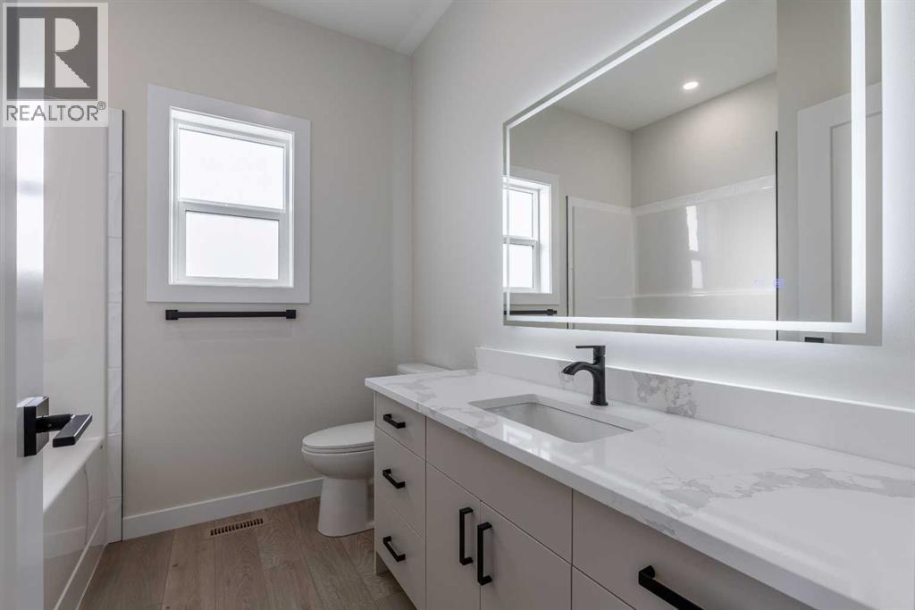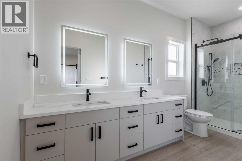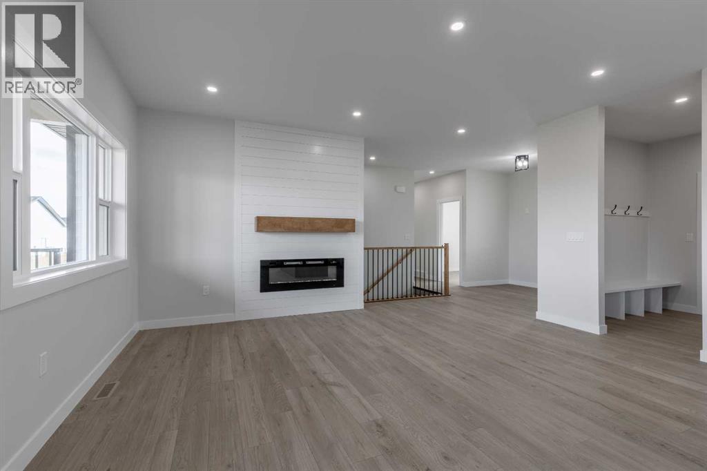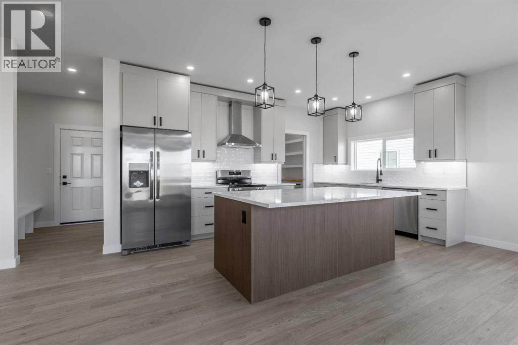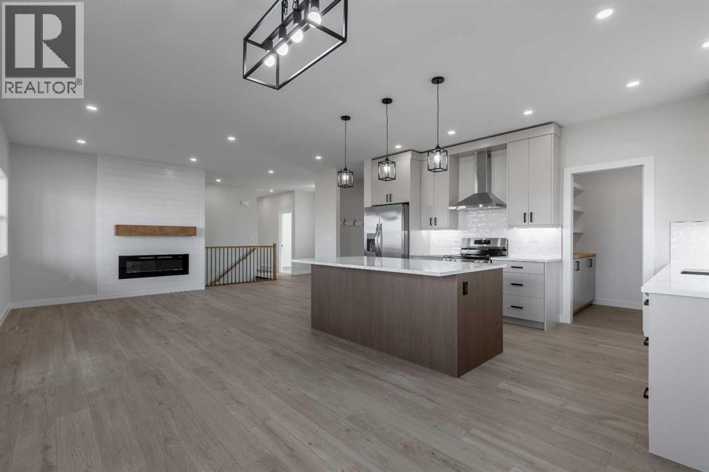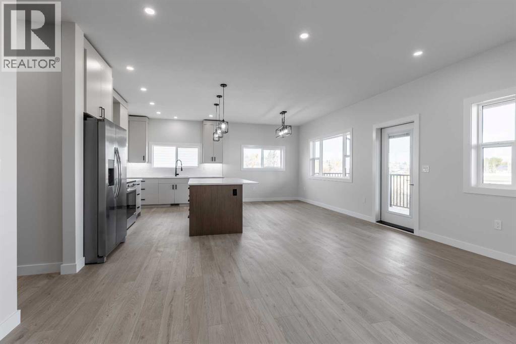 Welcome to this brand new build in the quaint and friendly town of Magrath just 20 minutes from Lethbridge! This beautiful home offers five bedrooms and three full bathrooms, giving families plenty of space to grow and enjoy. It features central air-conditioning, a bright main floor living room with a cozy electric fireplace, and a stylish kitchen with all new stainless steel appliances! The spacious dining area opens onto a large back deck that overlooks the nearly quarter-acre lot—perfect for kids to play, summer barbecues, or relaxing in the sun. With three bedrooms and the laundry room conveniently located on the main floor, this home is perfectly set up for young families! The primary suite includes a walk-in closet and a beautiful ensuite with a double vanity and walk-in shower. Downstairs, you’ll find a large family room ideal for movie nights or gatherings (a massive blank wall is calling for you to set up your projector!), as well as two more large bedrooms, and the third full bathroom. A double attached garage providing plenty of storage and convenience rounds out this spectacular home! Modern colour choices and finishes throughout give the home a clean, welcoming feel. Located in a fantastic neighbourhood in Magrath, this home has everything you could ask for—it’s just waiting for its new owners to move in and make it their own! Call your REALTOR® and book your showing today! (id:28267)
