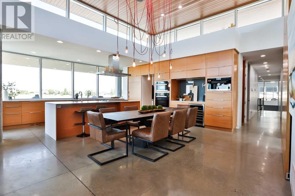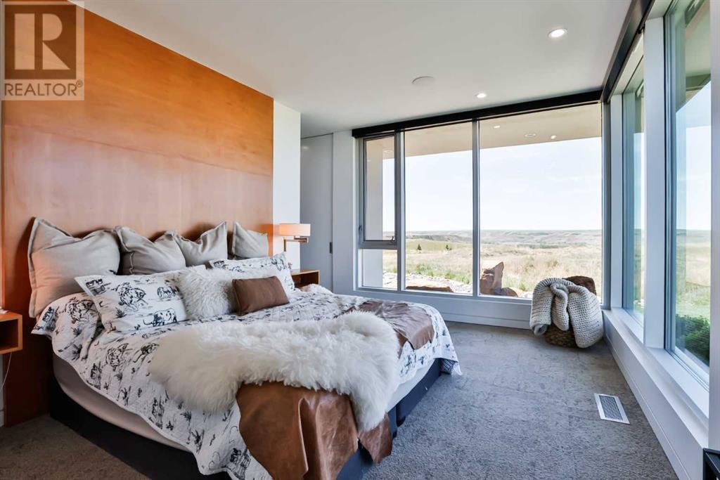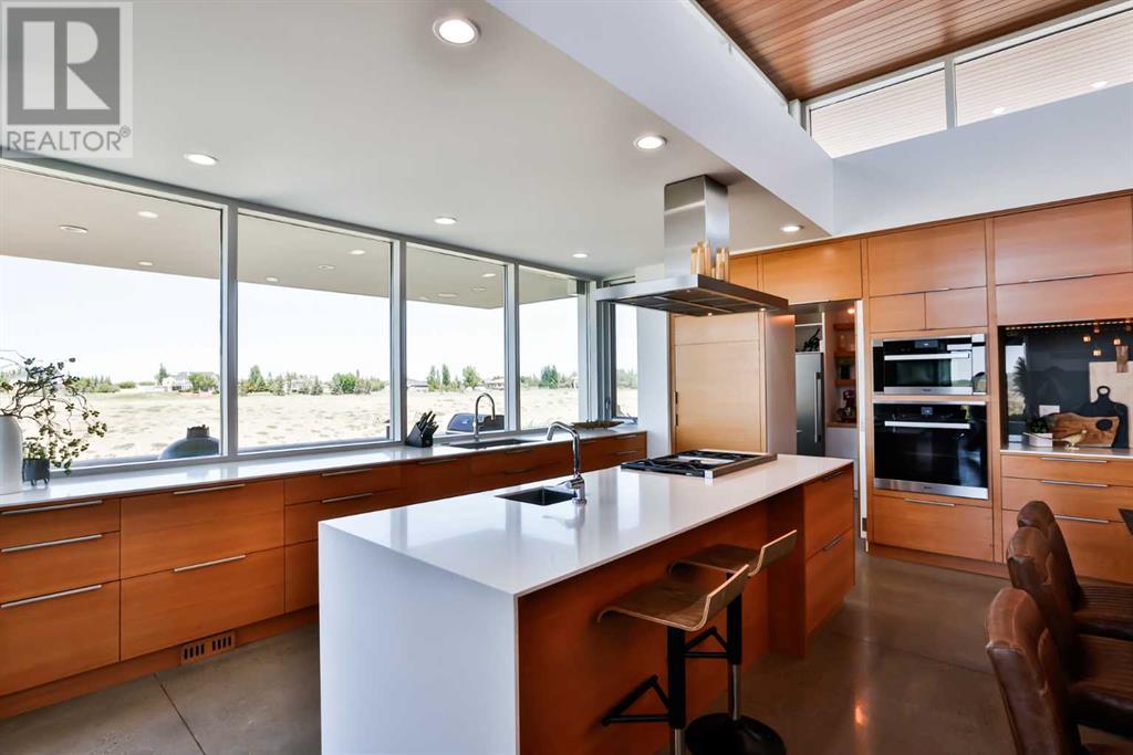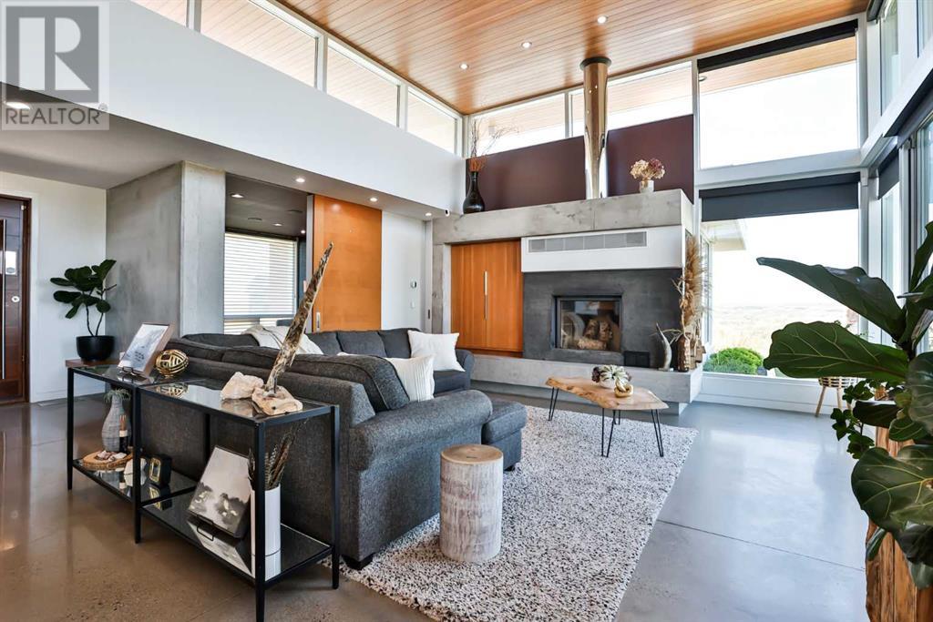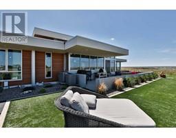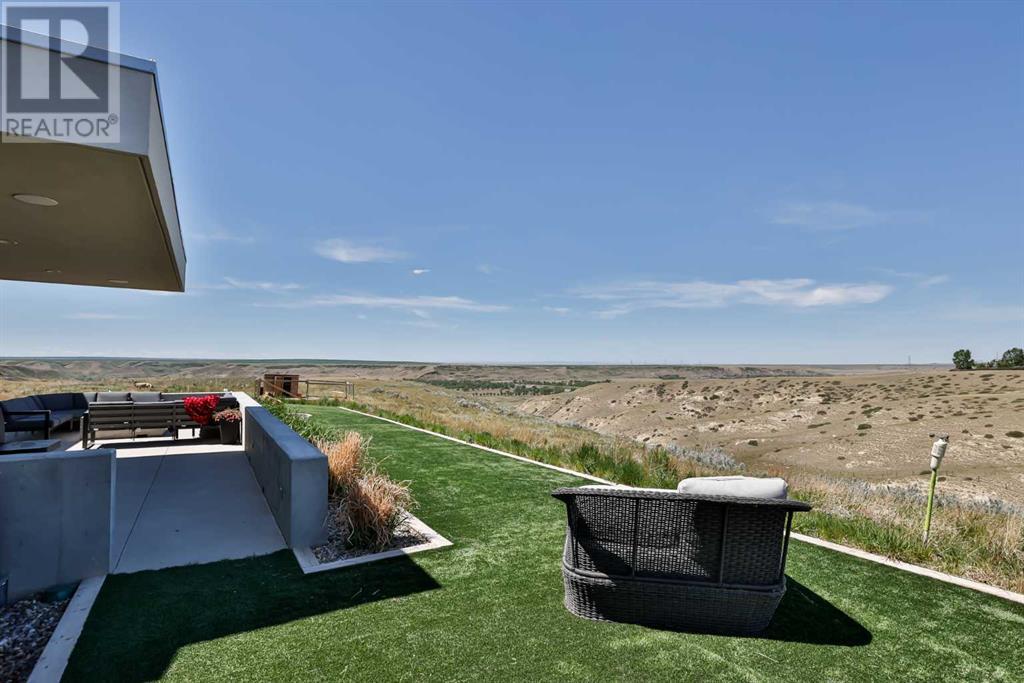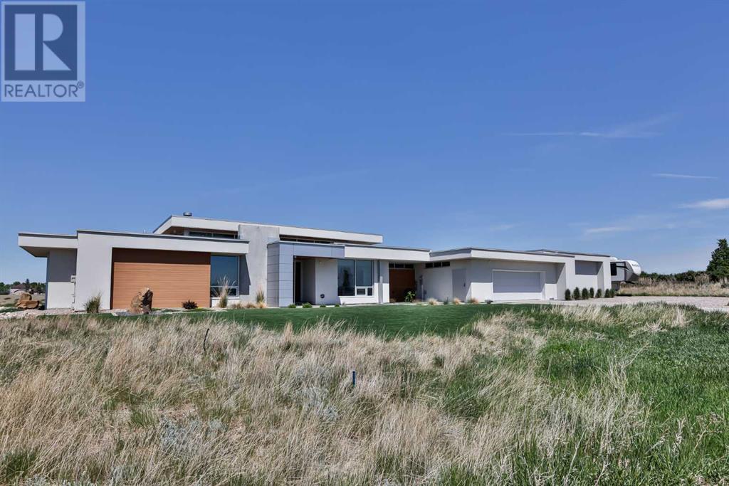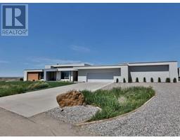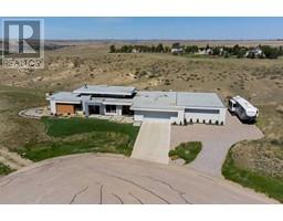 This property is as close to *Selling Sunset* as you'll find in Southern Alberta! This sprawling modern bungalow will capture your attention with the breathtaking view of the coulee in the distance. Stepping through the impressive wood pivot door, you know you're in for a treat. The main floor features 14-foot ceilings, complemented by floor-to-ceiling triple-pane commercial glass windows that will leave you speechless! The open-concept layout seamlessly combines the dining, living, and kitchen areas, with polished concrete floors being warmed by light wood cabinetry. The sleek white, quartz countertops, showcase your kitchen and island area, with windows that create a delightful connection between your indoor and outdoor spaces. The impressive appliance package, featuring a gas cooktop, a cabinet-paneled oversized fridge, a built-in microwave and oven, and a wine fridge. A coffee lover's dream, a built-in Miele espresso machine rivals even the best cafés. A cleverly hidden pantry door adds an extra touch of seamlessness! The living room is anchored by an oversized wood-burning fireplace, transom windows fill the space with natural light. There is an office with stylish floating shelves sits off of the Living room. The primary suite, features floor-to-ceiling windows that wrap the corner, providing spectacular morning & sunset views right from your bed. The walk-around closet is a shopper's dream, while the bright and airy ensuite features double vanities and a luxurious steam shower. Off the kitchen lies a spacious laundry/all-purpose room perfect for sewing or supervising homework while you prepare dinner. In the east wing, you’ll find three spare bedrooms. One has its own ensuite bathroom, while the other two share a Jack and Jill bathroom with a beautifully tiled shower, double vanities, and a skylight that invites natural light. Continuing down the hallway, another floor-to-ceiling glass panel reveals your very own gymnasium, measuring an impressive 32 x 40 fee t with 20-foot ceilings, complete with built-in basketball hoops, pickleball court & 3 wide closet for organizing all your sports gear. Floating wood stairs with striking black railings lead you to the basement living room, perfect for movie nights, and entertaining with your side bar. With large windows typical of a walkout basement, this space feels open and bright, completed by a half bath. Outside the gym exit, is a newly installed large sunken patio that blends with the home’s aesthetic. Complete with double gas fireplaces, a pergola, and oversized hot tub. The main patio off the kitchen features a covered deck, built-in speakers, a gas fire pit, and views that are unmatched in all of Southern Alberta. Equipped with cutting-edge technology, most lights, blinds, heating, cooling, and music can be controlled via a control panel or your phone—an upgrade valued at $100,000! The home also offers both forced air and indulgent in-floor heating. Call your REALTOR® for a private viewing today! (id:28267)