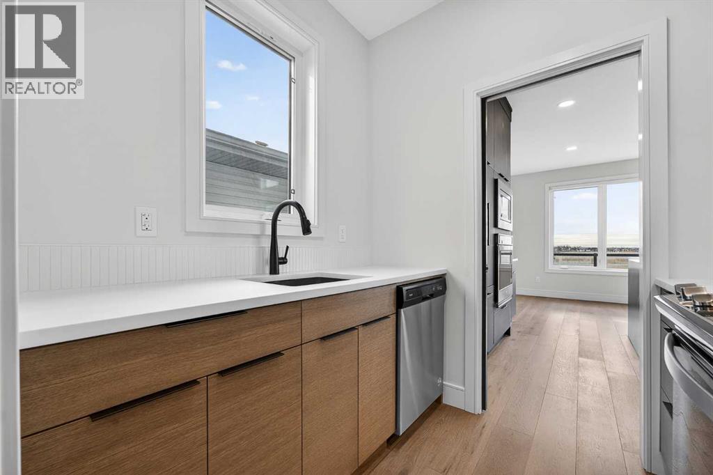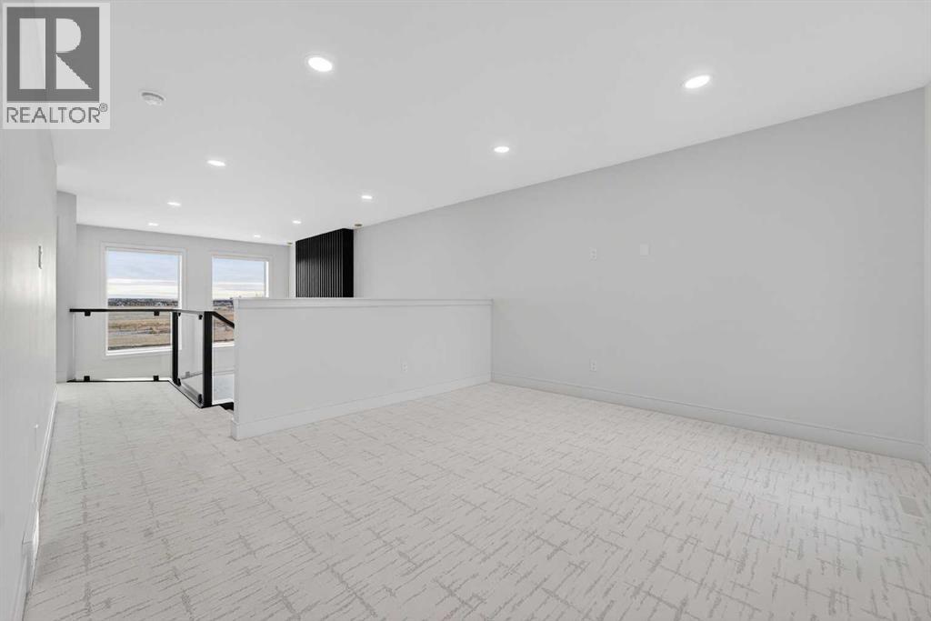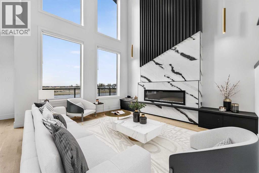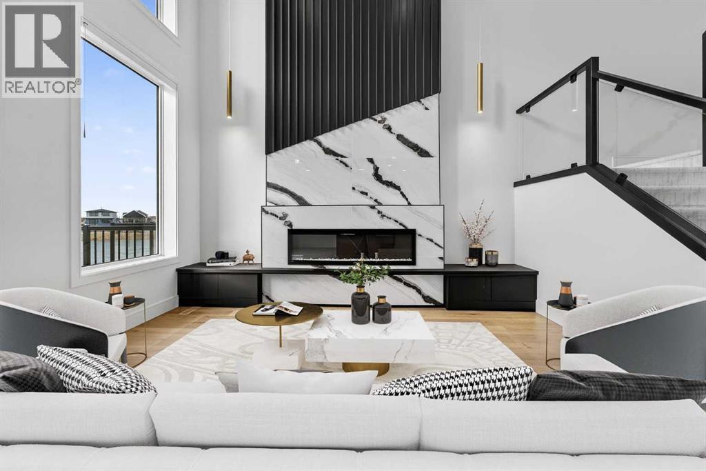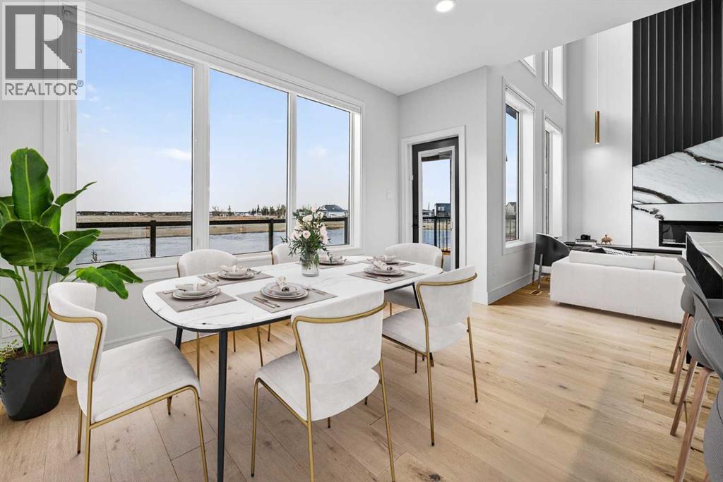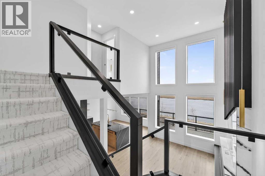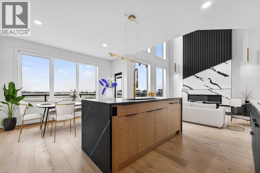 This brand new Stranville Living Master Builder showhome showcases the highly sought-after Perth 2 floor plan and is perfectly positioned in Southbrook with tranquil pond views and quick access to some of Lethbridge’s best amenities. Fully developed with a walkout basement, this home was designed to impress from the moment you step inside, blending bold architectural choices with everyday functionality in a way only a true showhome can.The main floor is anchored by a stunning open-to-above living room, where oversized windows frame the pond behind the home and flood the space with natural light. The fireplace is a true design feature here, set against dramatic vertical detailing and sleek modern finishes that instantly draw your eye upward and emphasize the home’s scale. The kitchen is equally striking, featuring a waterfall matte black island that grounds the space, paired with contrasting cabinetry, statement lighting, and a butler’s pantry complete with a gas range—ideal for both entertaining and keeping the main kitchen pristine. Step out back onto the full-length deck and enjoy uninterrupted pond views, making this space as functional as it is scenic.Upstairs, the second level offers three spacious bedrooms and a large bonus room that works perfectly as a family lounge, media space, or kids’ retreat. The primary bedroom is a standout, with expansive pond views that feel calm and private, and an ensuite that rivals a luxury hotel. Here you’ll find a floating vanity with undermount lighting, a skylight that fills the room with natural light, a standalone soaker tub, and a beautifully finished curbless shower. The walk-in closet is thoughtfully designed to connect directly through to the main floor laundry room, adding a level of convenience that’s both smart and intentional.The fully developed walkout basement continues the home’s versatility, offering two additional bedrooms, a four-piece bathroom, and direct access to the backyard and pond beyond. Whether you’re looking for space for family, guests, or simply want a home that showcases premium design from top to bottom, this Southbrook showhome delivers on every level with views, layout, and finishes that truly set it apart. (id:28267)