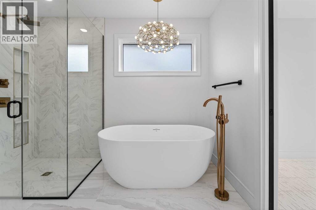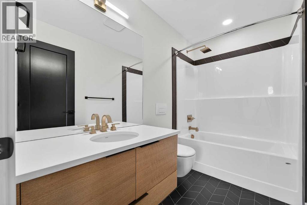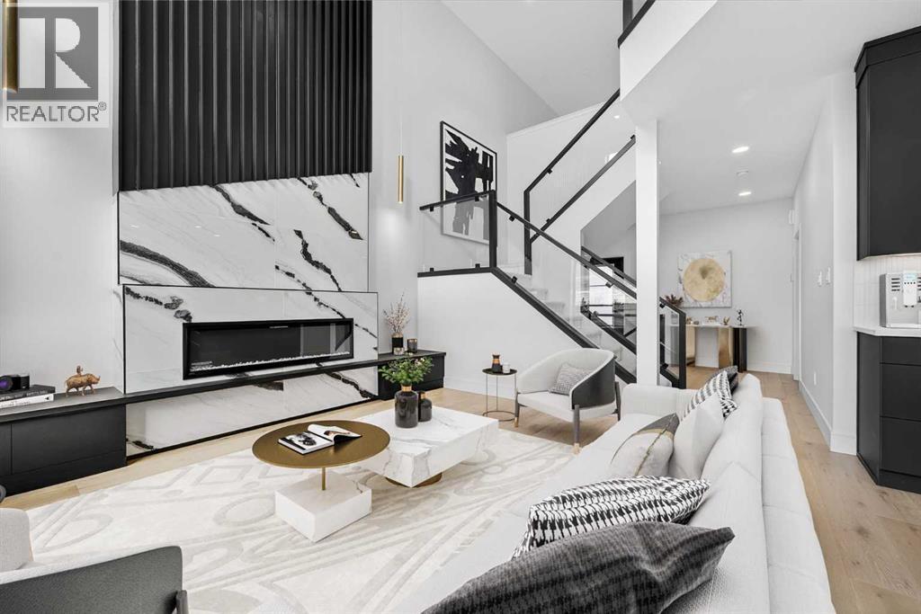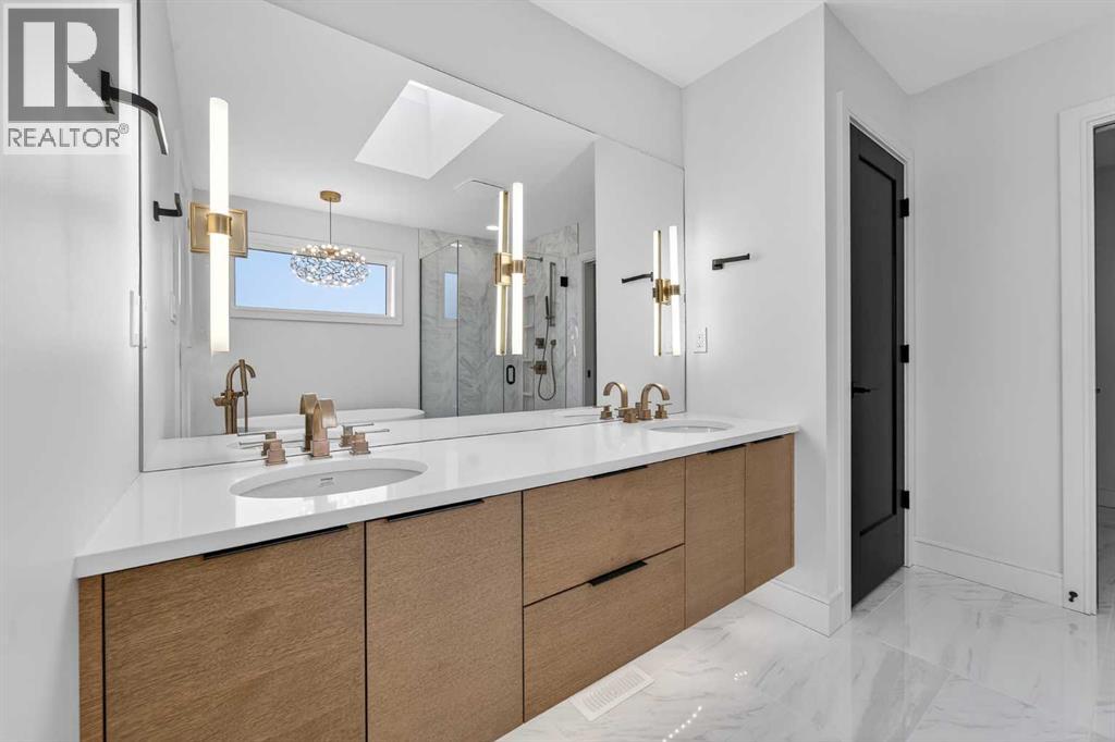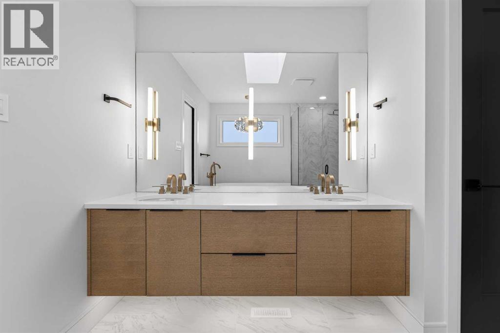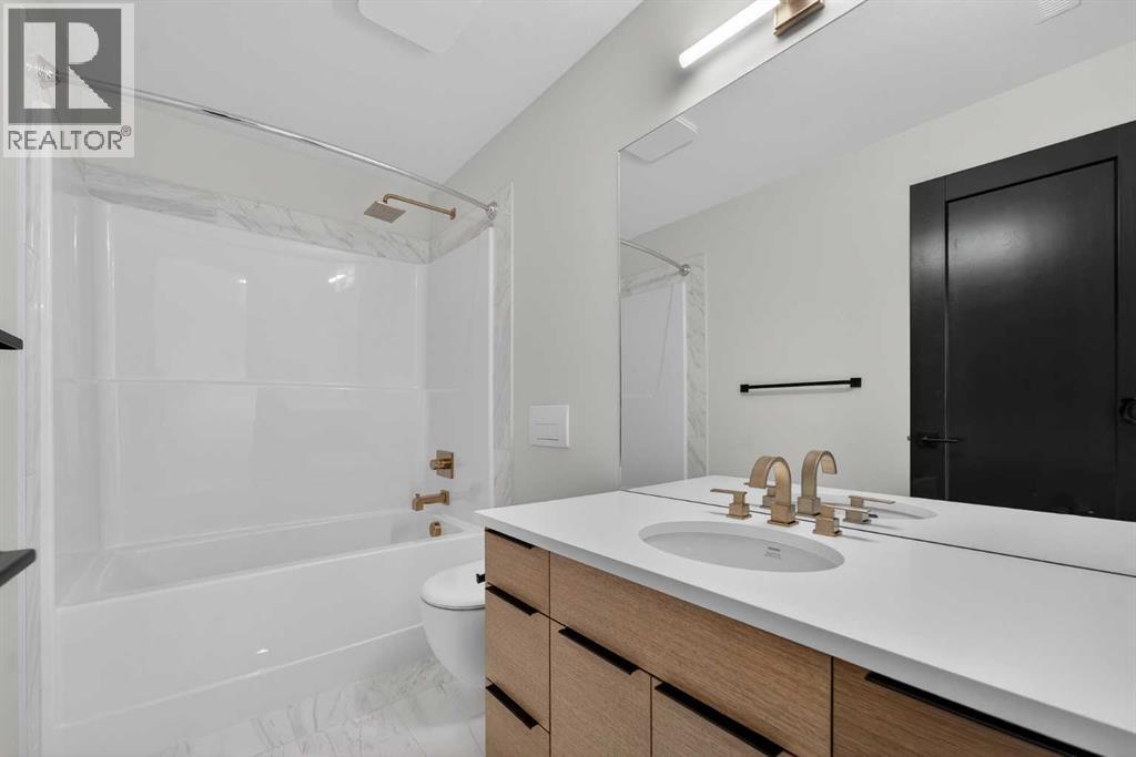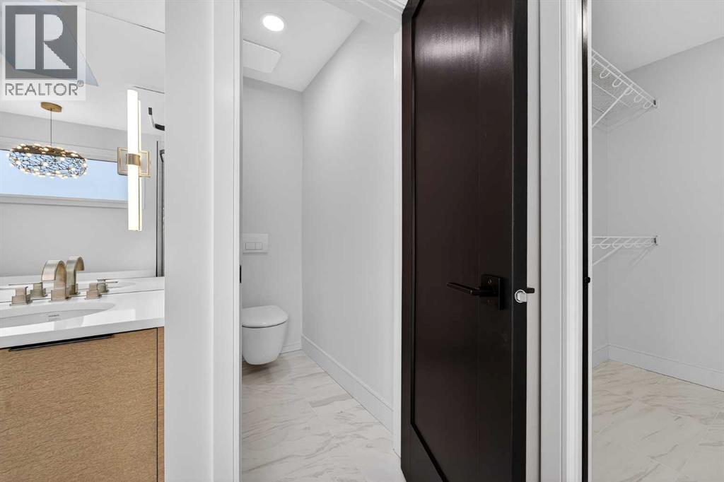 This brand new Stranville Living Master Builder showhome showcases the highly sought-after Perth 2 floor plan and is perfectly positioned in Southbrook with tranquil pond views and quick access to some of Lethbridge’s best amenities. Fully developed with a walkout basement, this home was designed to impress from the moment you step inside, blending bold architectural choices with everyday functionality in a way only a true showhome can.The main floor is anchored by a stunning open-to-above living room, where oversized windows frame the pond behind the home and flood the space with natural light. The fireplace is a true design feature here, set against dramatic vertical detailing and sleek modern finishes that instantly draw your eye upward and emphasize the home’s scale. The kitchen is equally striking, featuring a waterfall matte black island that grounds the space, paired with contrasting cabinetry, statement lighting, and a butler’s pantry complete with a gas range—ideal for both entertaining and keeping the main kitchen pristine. Step out back onto the full-length deck and enjoy uninterrupted pond views, making this space as functional as it is scenic.Upstairs, the second level offers three spacious bedrooms and a large bonus room that works perfectly as a family lounge, media space, or kids’ retreat. The primary bedroom is a standout, with expansive pond views that feel calm and private, and an ensuite that rivals a luxury hotel. Here you’ll find a floating vanity with undermount lighting, a skylight that fills the room with natural light, a standalone soaker tub, and a beautifully finished curbless shower. The walk-in closet is thoughtfully designed to connect directly through to the main floor laundry room, adding a level of convenience that’s both smart and intentional.The fully developed walkout basement continues the home’s versatility, offering two additional bedrooms, a four-piece bathroom, and direct access to the backyard and pond beyond. Whether you’re looking for space for family, guests, or simply want a home that showcases premium design from top to bottom, this Southbrook showhome delivers on every level with views, layout, and finishes that truly set it apart. (id:28267)